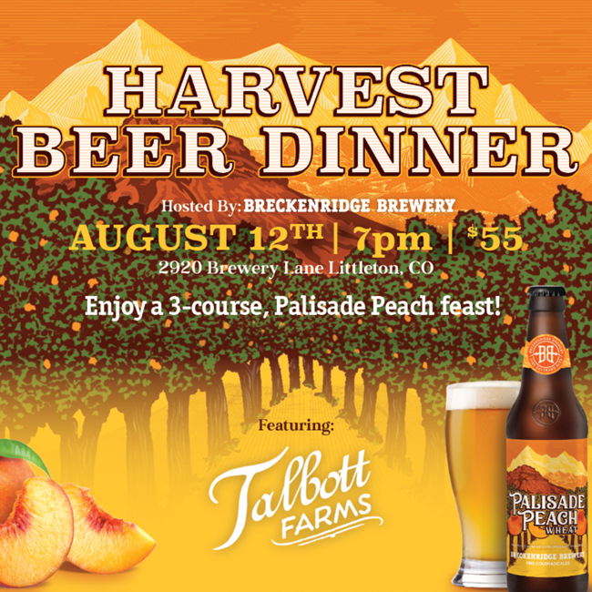 Culture czar Todd Thibault (Breckenridge Brewery,) and Joe Talbot (owner, Talbot Farms,) guide you through a 3-course, Palisade Peach feast created by the Farm House team of chefs. Set in our beloved outdoor beer garden, you’ll enjoy a seasonal beer pairing alongside Rocky Mountain views! See menu below: